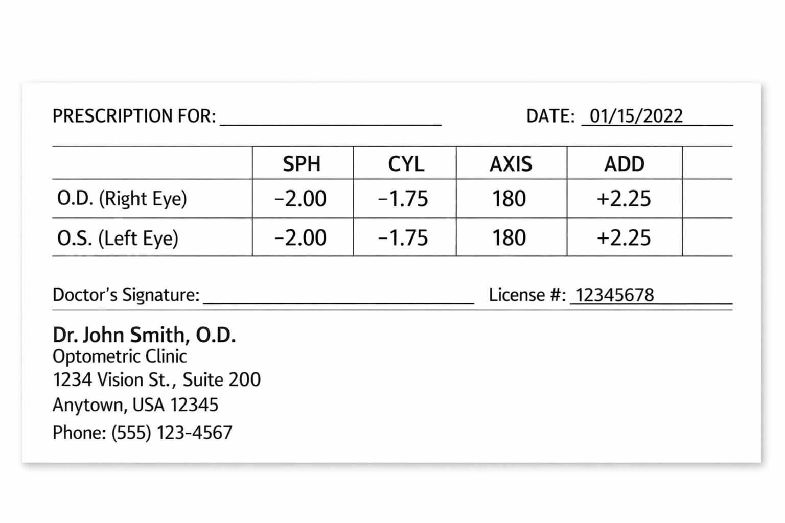 “An eye prescription explains how lenses should be designed to correct your vision. The numbers describe how light focuses in each eye and typically include measurements like SPH (sphere), CYL (cylinder), AXIS, ADD, and PD. These values help optometrists, opticians, and lens manufacturers create eyeglasses or contact lenses that allow you to see clearly.”